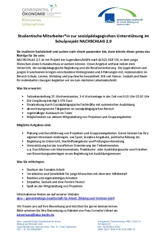 Studentische Mitarbeiter*in zur sozialpädagogischen Unterstützung im Schulprojekt NACHSCHLAG 2.0
